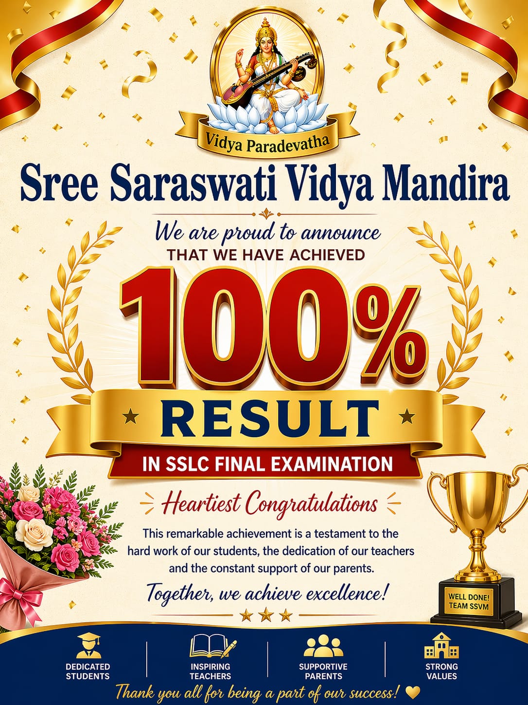 Though the institution was established with a modest strength, his strong sense of conviction and courage carried him all through in building and developing an institution of great distinction and reputation. Not only the Institution grew from strength to strength, now SSVM Group has over 6 schools with affiliations to CBSE/State Boards taking the student strength to over 4000.